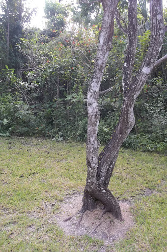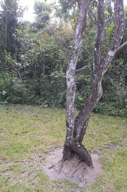 This is a tough picture to see, but there are lots of green specks on the tree...those are ANTS and each one was carrying a leaf down the tree...FIRE ANTS!